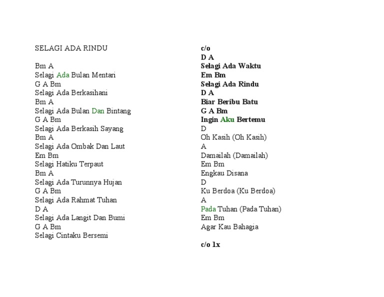 Intro Am G F Am F G Am Am G Dm Am C G F G Am Verse 1 Am G selagi ada bulan mentari F G Am selagi ada berkasihani Am G selagi ada bulan dan bintang F G Am selagi ada berkasih sayang C G selagi ada ombak dan laut Dm Am selagi hatiku terpaut C G selagi ada turunnya hujan F. Chorus Selagi ada waktu Selagi ada rindu Biar beribu batu Ingin aku bertemu. Bismillahirahmanirahim A very good day to bloggers Aku terkedu sejenak dengar adik bongsu aku menyanyi bait2 lirik lagu dari Pak Long bertajuk Selagi Ada Rindu nih mase dalam kereta gi majlis Convocation adik pompuan aku couple of week agoSeketul-ketul kuar lirik tuh dari mulut dia yang petah tuh.
